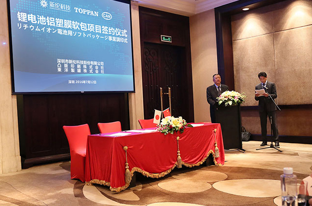 2016 年 7月 12 日午前10時、新綸科技が凸版印刷株式會社、東洋製缶株式會社、及び株式會社T&T Enertechno と、深圳市華僑城洲際ホテルで、「リチウムイオン二次電池用外裝材料プロジェクト」の調(diào)印式を行い、當プロジェクトの各子契約を正式に締結(jié)した。
